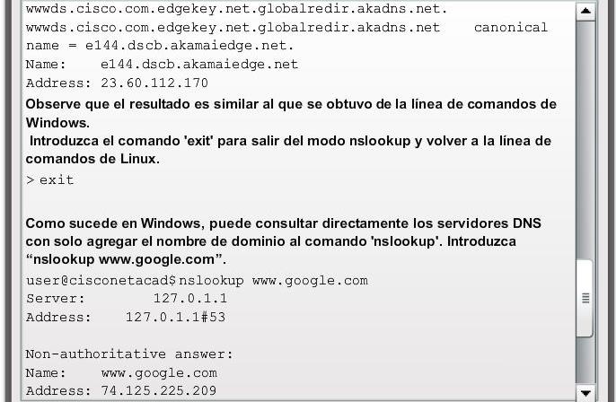 Las consultas mostradas en la figura son sólo pruebas simples. La utilidad nslookup tiene muchas opciones disponibles para realizar una prueba y una verificación exhaustivas del proceso DNS. Al finalizar, escriba exitpara salir de la utilidad nslookup.